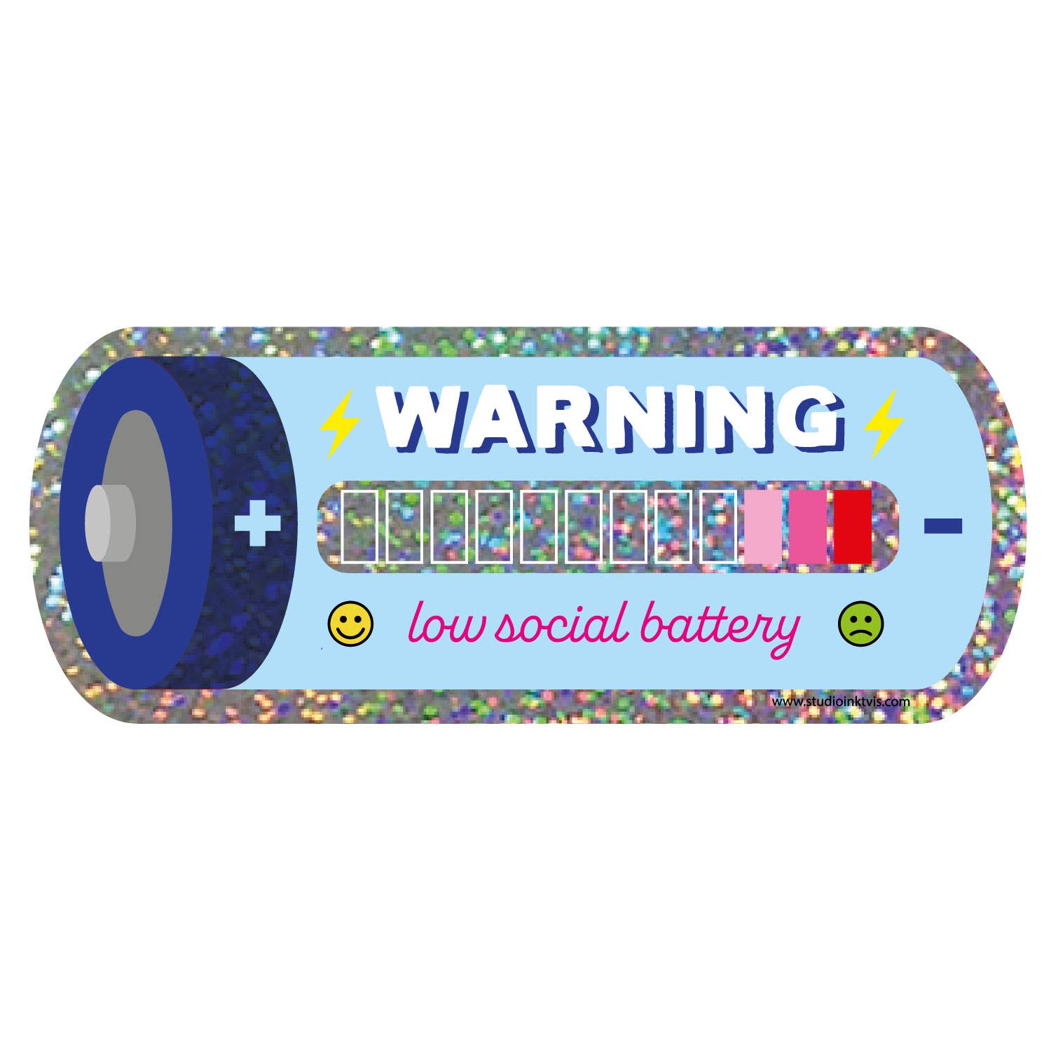 Glitterklistermärke "Lågt socialt batteri" – Kawaii sticker för laptop & mer