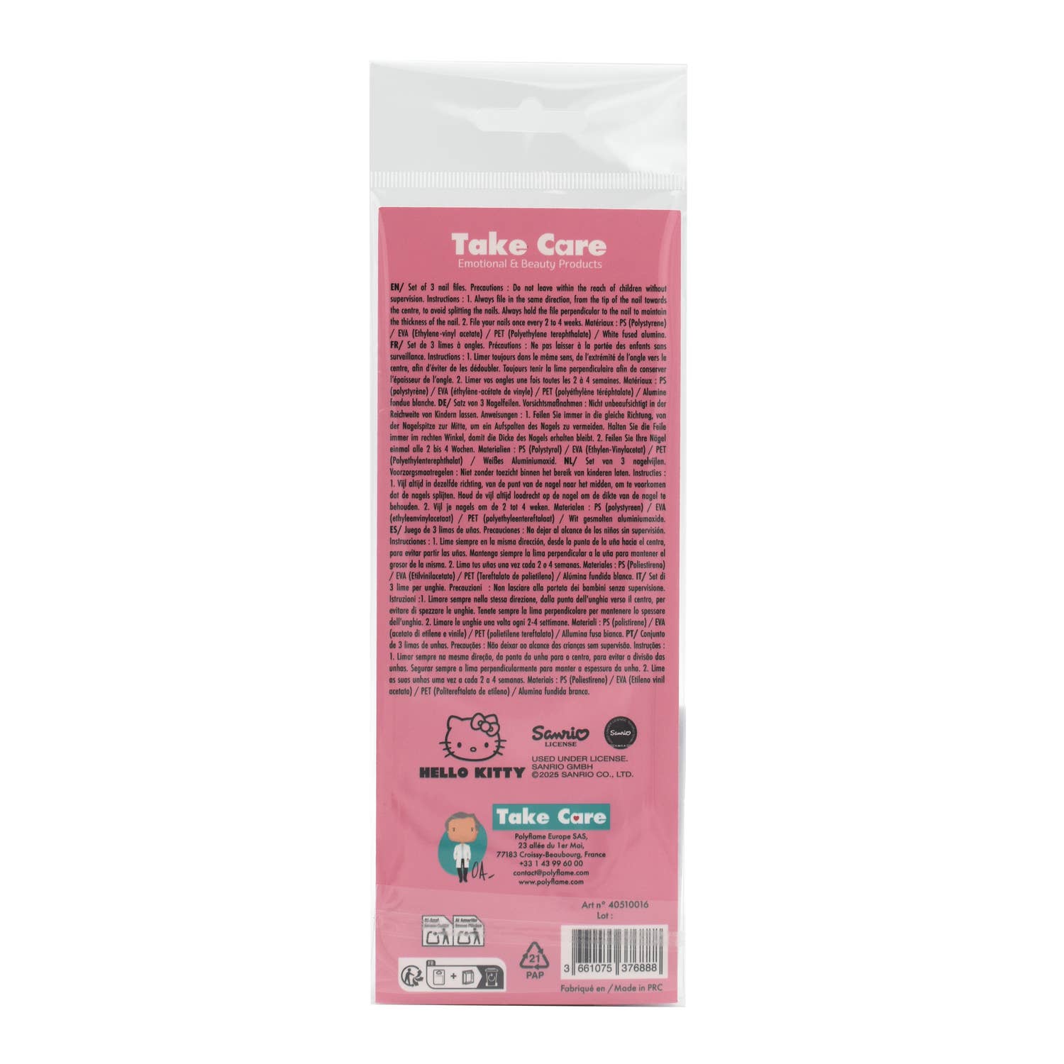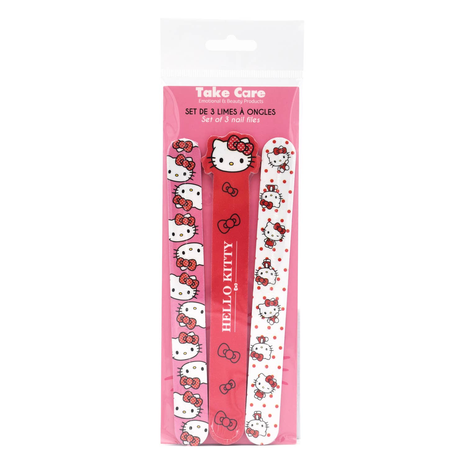 Setet med 3 Hello Kitty nagelfilar är den perfekta accessoaren för att vårda dina naglar med varsamhet och precision. Varje fil är dekorerad med den välkända Hello Kitty-figuren och ger en manikyrupplevelse som både är praktisk och charmig. De är idealiska för en jämn och slät finish samtidigt som de tillför en lekfull touch till din skönhetsrutin.